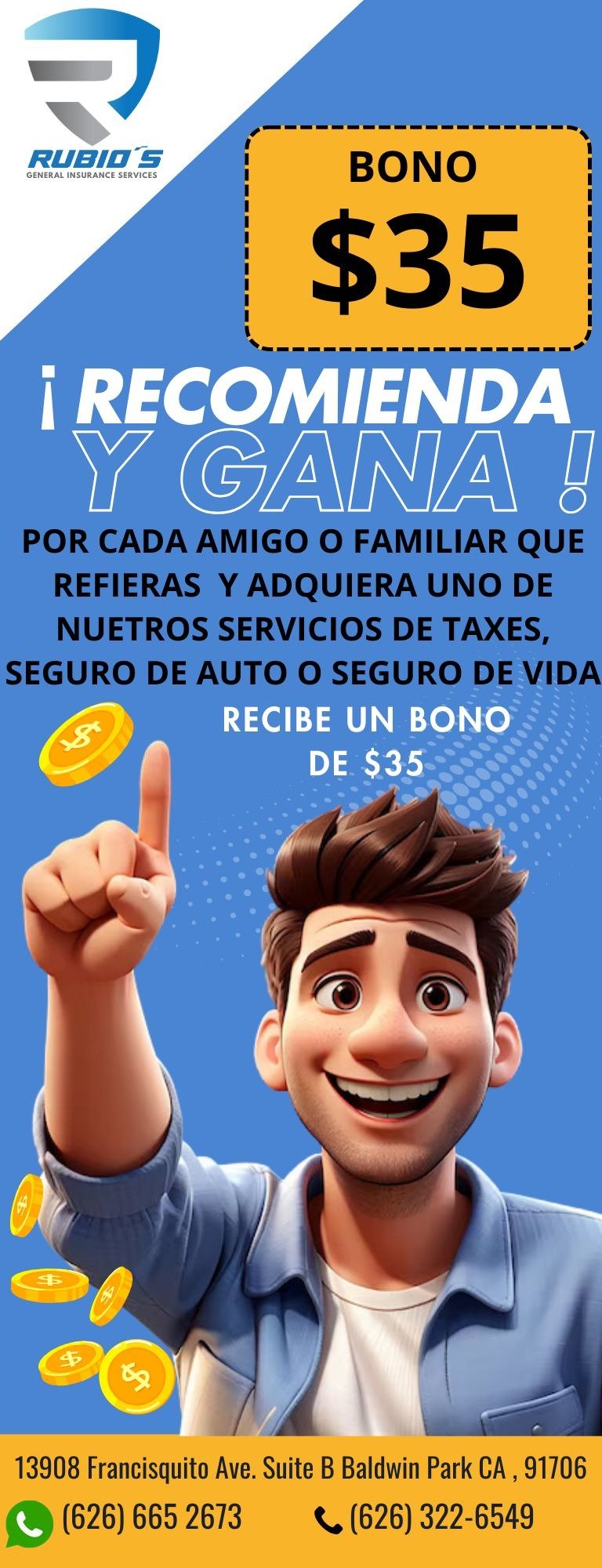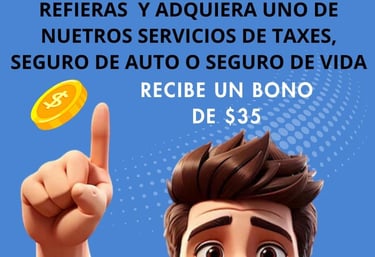 “Por cada amigo o familiar que refieras y contrate nuestros servicios con nosotros, te damos un bono en efectivo de $35, puedes utilizarlo inclusive en pago de tu aseguranza mensual de tu auto, seguro de vida o servicio de taxes.